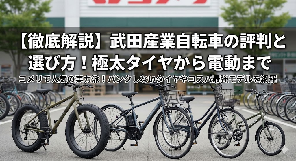 【徹底解説】武田産業自転車の評判と選び方!極太タイヤから電動まで 自転車の購入を検討する際、ホームセンターのコメリなどでよく見かける「武田産業」というメーカーが気になっている方も多いのではないでしょうか。 毎日の通勤・通学や買い物に使う自... -