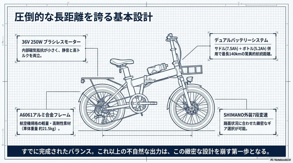 特筆すべきは、革新的な「デュアルバッテリーシステム」です。本体のシートポスト部分に内蔵されるサドルバッテリー(36V 7.5Ah / 7,500mAh)に加え、オプションとしてフレームにボトル型の予備バッテリー(36V 5.2Ah / 5,200mAh)を追加装着することが可能です。