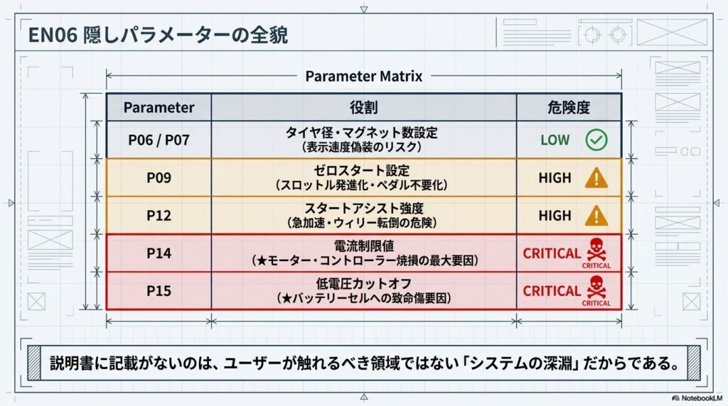 多くの海外製e-bikeやEENOUR C4に採用されている「EN06 LCDパネル」は、単なる速度やバッテリー残量の表示器ではありません。ユーザーが内部のシステムパラメータ(Pメニューと呼ばれる階層)にアクセスし、車両の基本的な挙動や出力制限を詳細に定義できる設計になっています。
