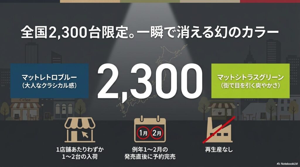 限定カラーの最大の特徴は、全国合計で2,300台のみの限定生産など、非常に数が絞られている点です。全国に数千店舗ある自転車販売店に対して割り当てられるため、1店舗あたりわずか1〜2台程度しか入荷しない計算になります。