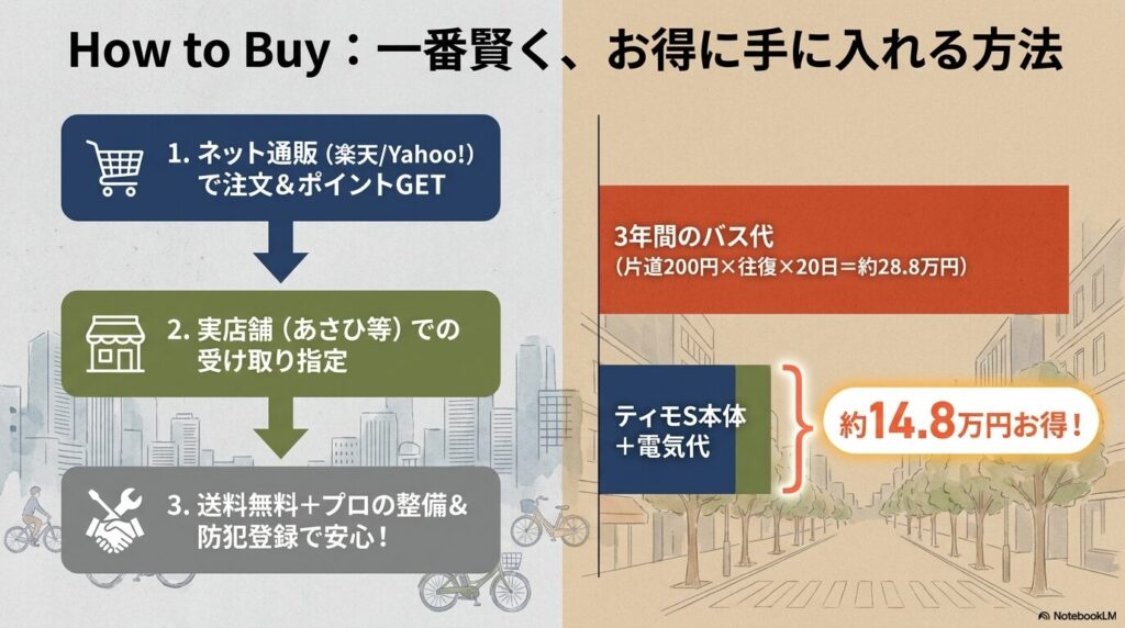 初期費用が高く感じるかもしれませんが、長期的な視点で見ると非常に経済的です。仮にバス通学(片道200円)を週5日・3年間続けた場合、交通費は約28.8万円かかります。