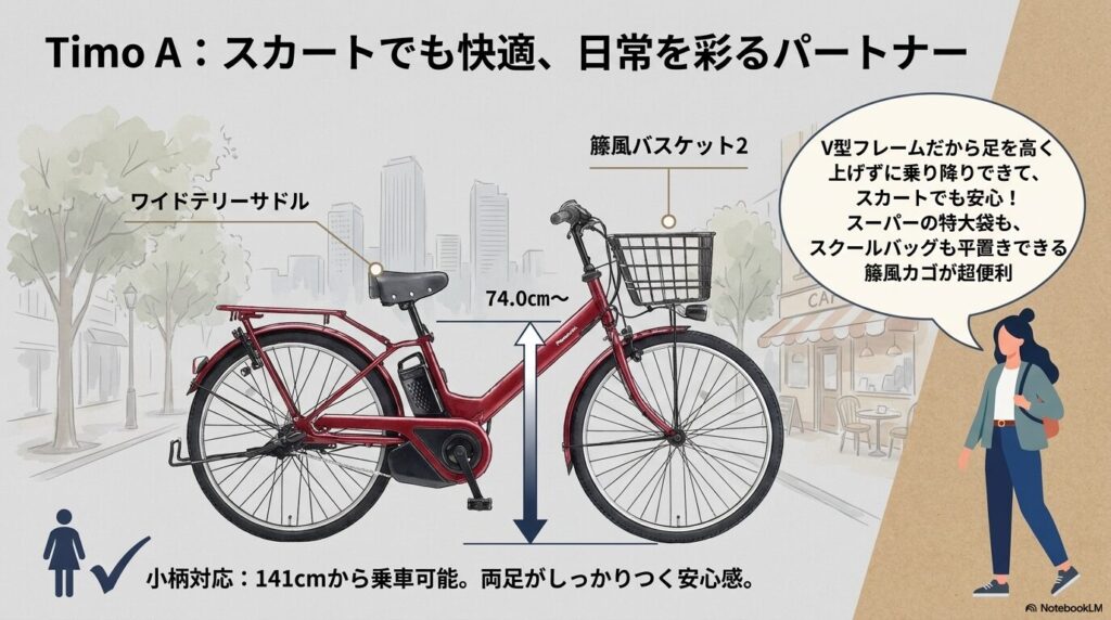 - ティモAは乗り降りしやすいV型フレームを採用し、小柄な方(141cm〜)に最適