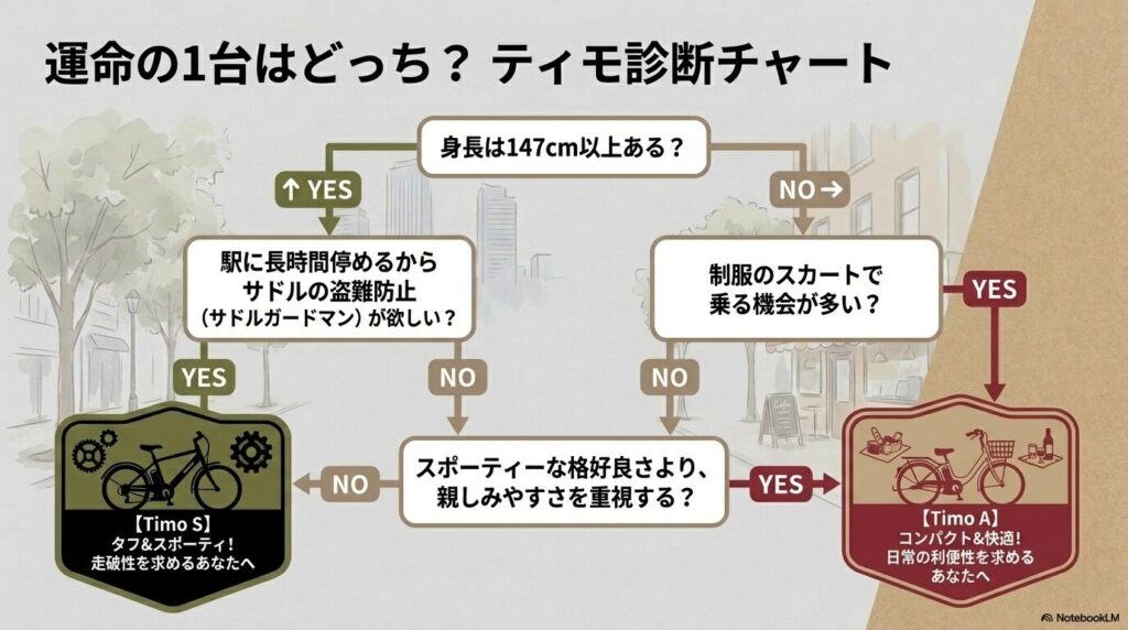 - 身長が高く、スポーティーなかっこよさとサドルの防犯性を求めるなら「ティモS」一択