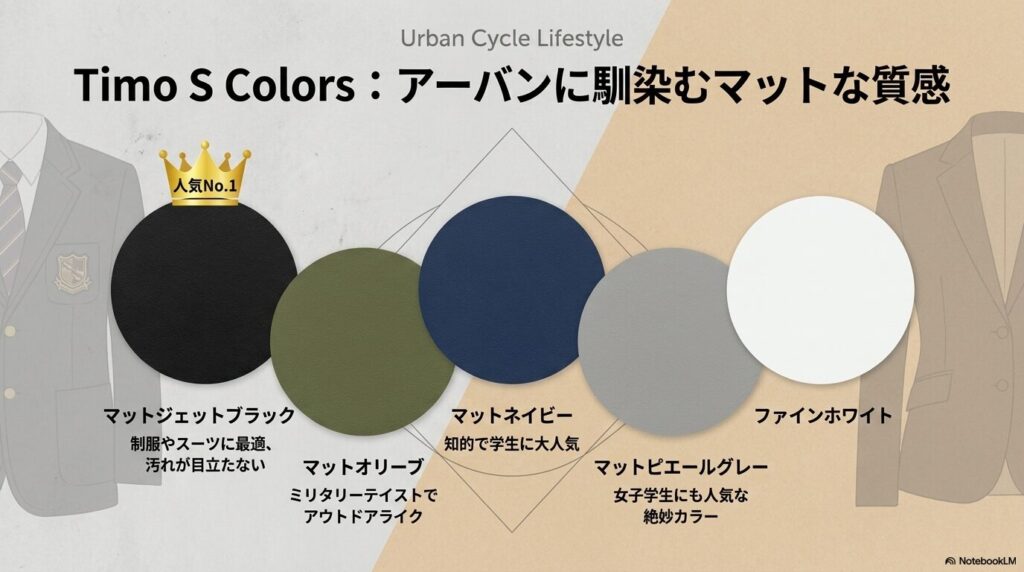 毎日乗る電動アシスト自転車選びにおいて、スペックと同じくらい重要なのがカラーリングです。ティモ・Sは、直線的でスタイリッシュなフレームデザインにマッチする落ち着いたマットカラー(艶消し)を中心にラインナップされています。ここでは、サイクルショップ等でよく選ばれている人気色を詳しくご紹介します。