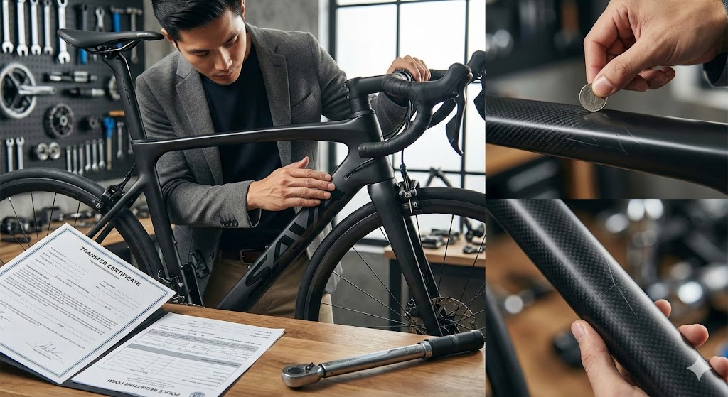 最大の懸念点は「カーボンのダメージ」です。カーボンフレームは表面の傷だけでなく、内部に生じた微細な剥離(デラミネーション)が致命傷になることがあります。特に、前オーナーが落車していたり、トルク管理をせずにパーツを締め付けていたりした場合、見た目は綺麗でも走行中に破断する恐れがあります。