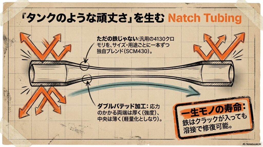その耐久性を支えているのが、前述した独自の鋼材哲学「Natch」です。一般的に流通している汎用的な4130クロモリ鋼のパイプをそのまま使うのではなく、モデルの用途やフレームサイズごとに、パイプの厚みやバット(厚みが変化する部分)の長さを1本1本細かく設計・調整しています。