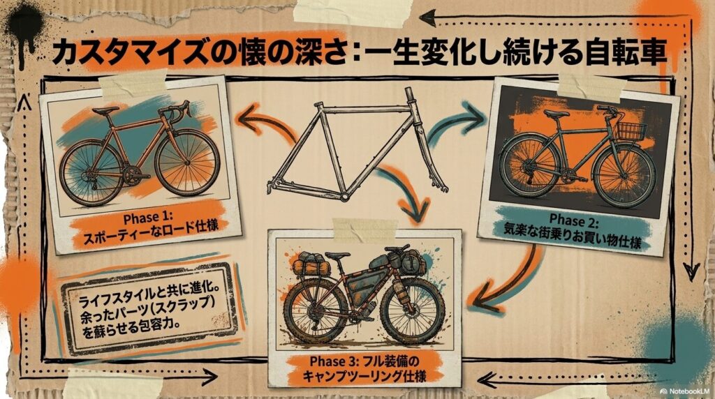 ユーザーの中には、1台のフレームを長年にわたって変化させ続ける人も珍しくありません。例えば、購入から最初の数年はドロップハンドルでスポーティーなロードバイク仕様として楽しみ、ライフスタイルの変化に合わせてフラットバーと前カゴを取り付けたお買い物仕様に変更。