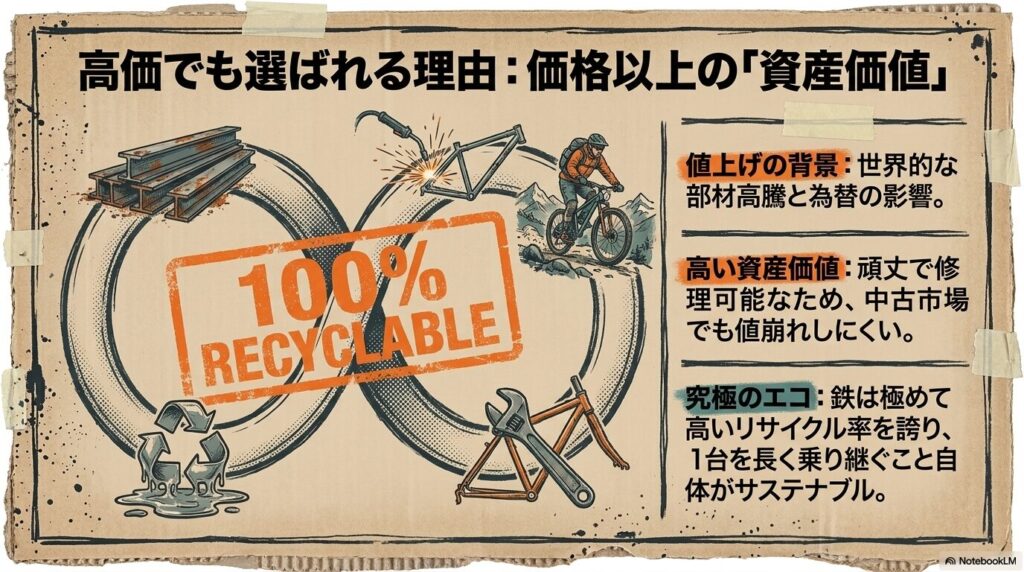 一つは、世界情勢による輸送費の高騰や、自転車部品全体の価格上昇です。また、ディスクブレーキの標準化や、より高度なチューブ成形技術の採用など、自転車自体のスペックが底上げされていることも要因です。