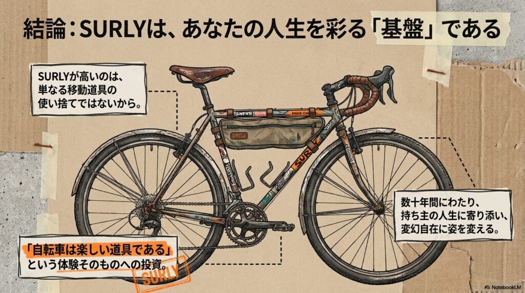 サーリーが高いのは、それが単なる移動のための使い捨ての道具ではなく、数十年間にわたって持ち主のライフスタイルに寄り添い、変幻自在に姿を変えることができる「一生モノの基盤」だからです。