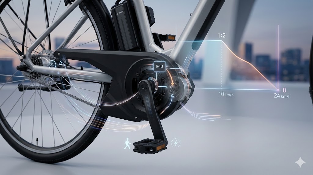 時速10km未満の低速域では人力1に対して最大2の力でアシストすることが許されていますが、時速10kmを超えると、速度が上がるにつれてこの補助力は徐々に減少していきます。そして最終的に時速24kmに達した瞬間、アシスト力はゼロ(0)にならなければなりません。